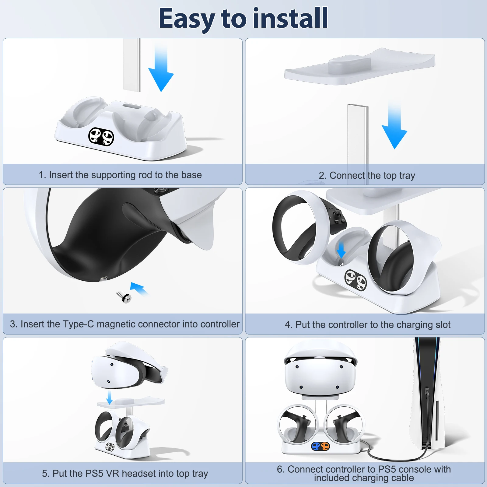 Installation is simple—just connect the included Type-C cable, attach the magnetic adapters, and set the stand in place. Ideal for players who want a streamlined and visually clean VR station.