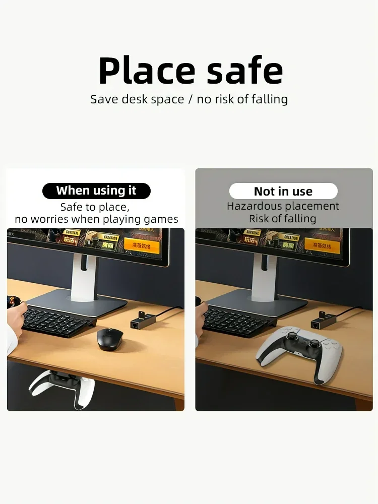Crafted from sturdy, non-slip plastic, the bracket features smooth corners and grooves that prevent sliding, scratches, or wear to your controllers. The adhesive mount design makes installation effortless — simply peel, stick, and secure the holder under your desk, no drilling or tools required.
