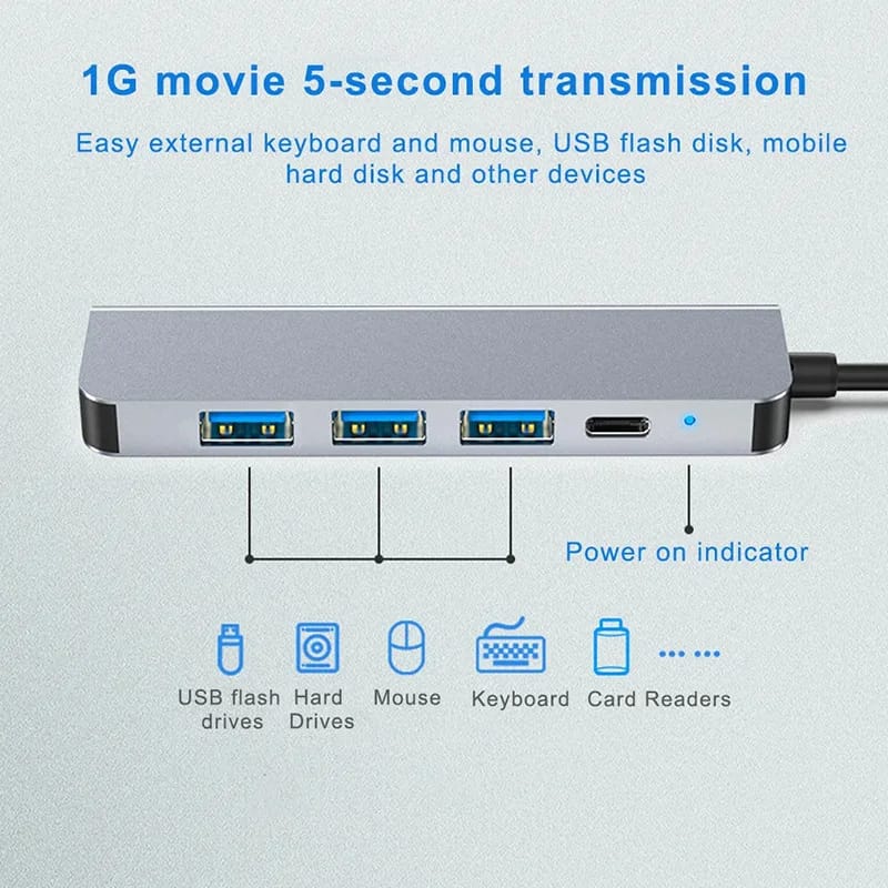 Transfer files quickly with USB 3.0 (5Gbps) and USB 2.0 (480Mbps) ports — perfect for keyboards, mice, flash drives, and more. Compact and lightweight, this hub fits easily into any setup or travel bag, offering plug-and-play convenience without the clutter of extra cables.