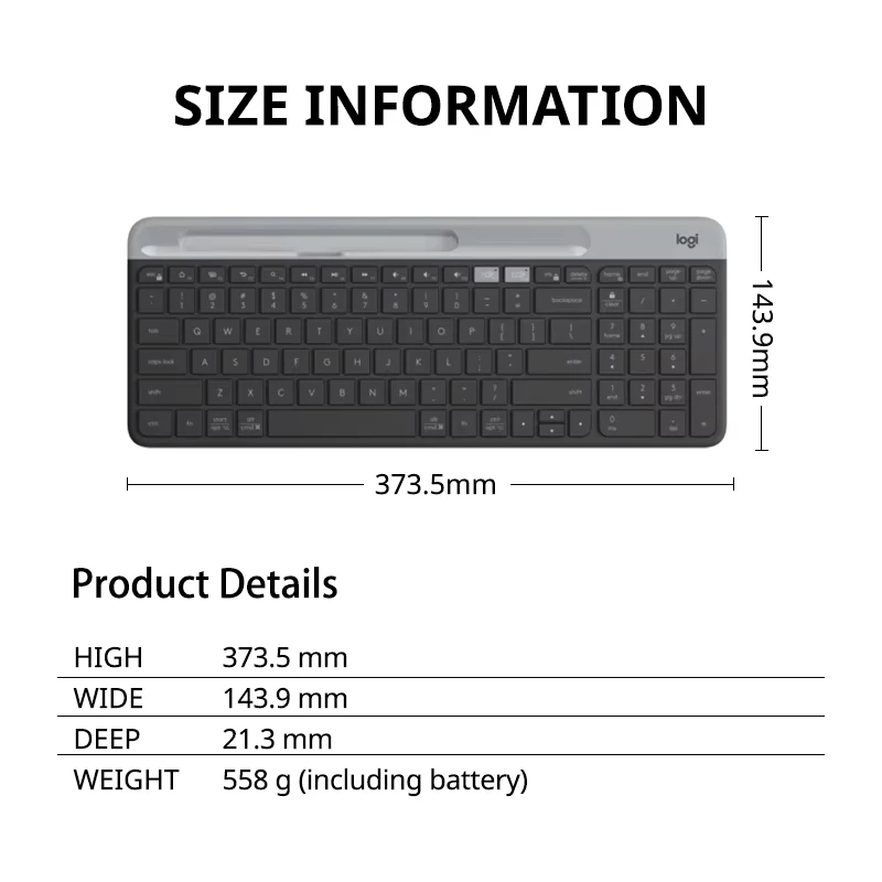 A slim, lightweight multi-device wireless keyboard with full-size functionality, dual-mode connectivity, and seamless switching between your computer, tablet, and phone.