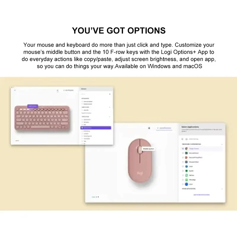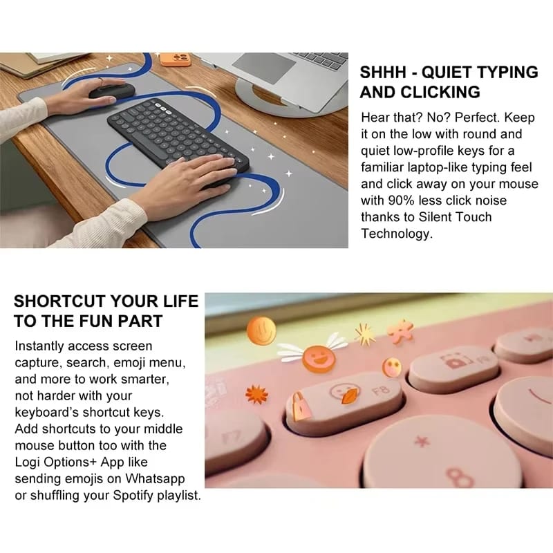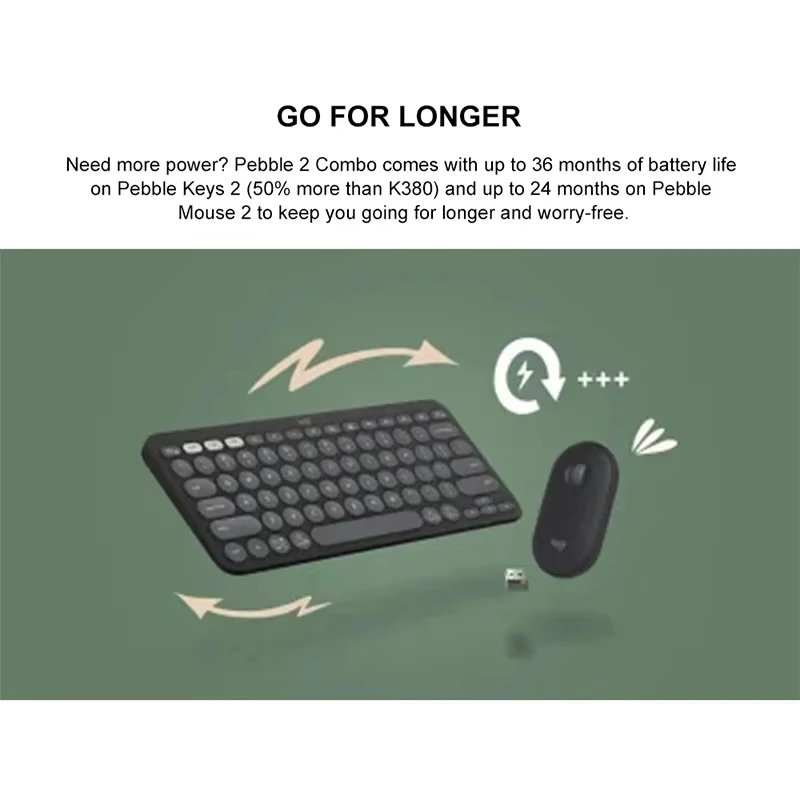 Designed for multitaskers, the Pebble 2 Combo connects to up to three devices at once—switch between your laptop, tablet, or phone with a single tap. The mouse includes a customizable middle button, and the keyboard includes 10 programmable Fn keys via the Logi Options+ software, allowing you to personalize your workflow easily.