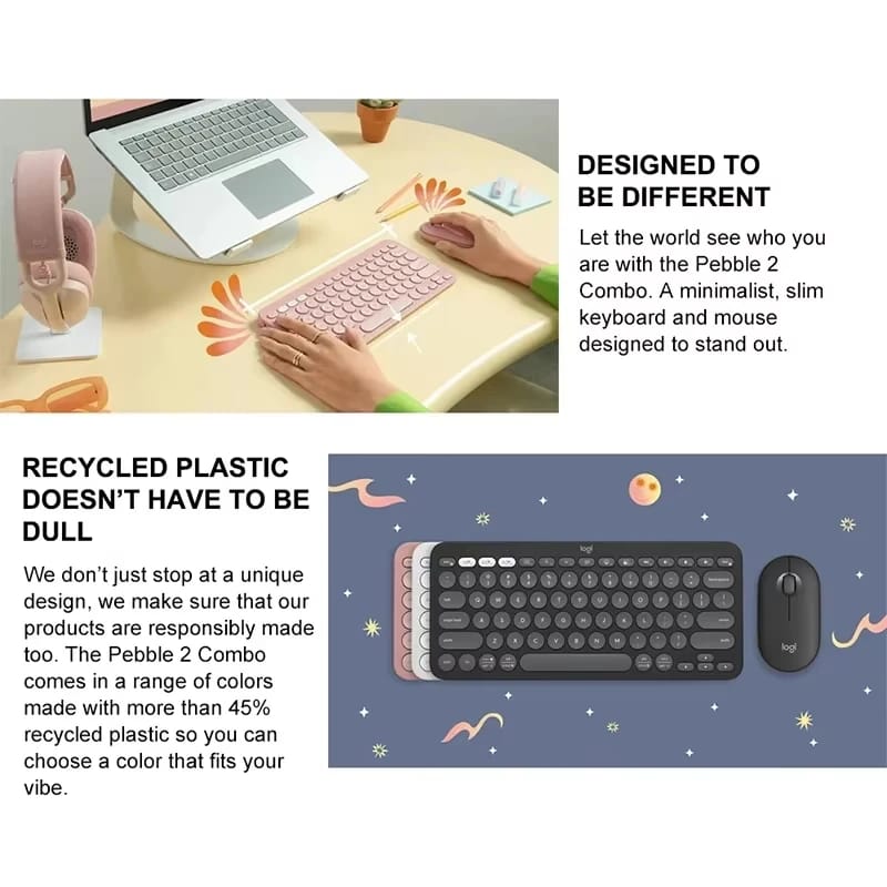 The Logitech Pebble 2 Combo is a minimalist wireless keyboard and mouse set built for modern workspaces. With its slim profile and clean design, it fits seamlessly into home offices, study areas, and on-the-go setups. The low-profile keyboard offers quiet, laptop-style typing with scooped keys for comfort, while the Pebble mouse delivers ultra-silent clicks using Logitech’s Silent Touch technology.