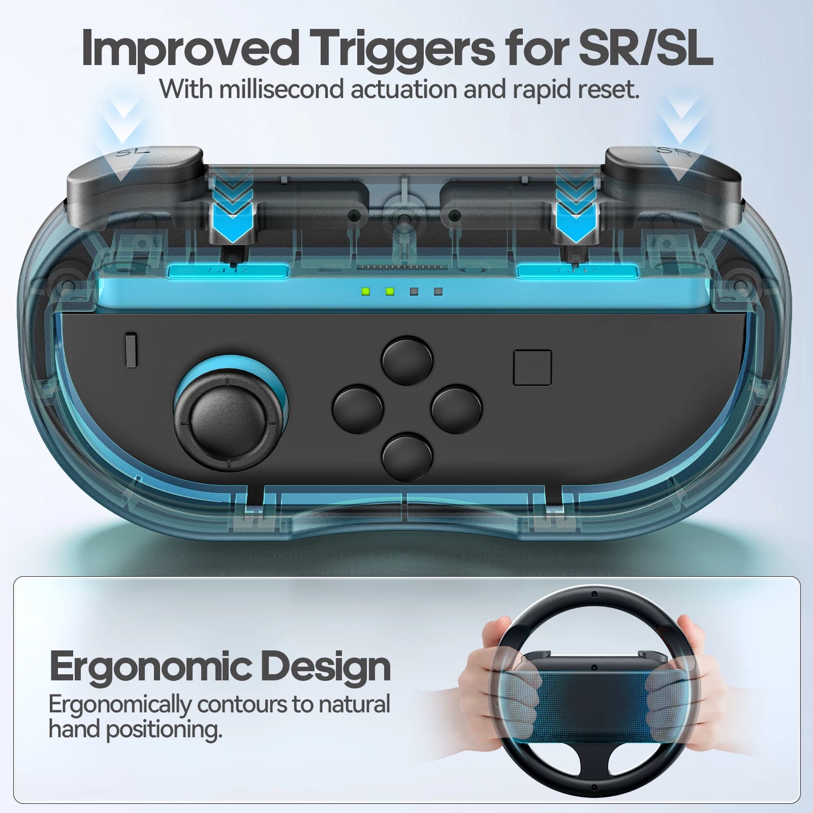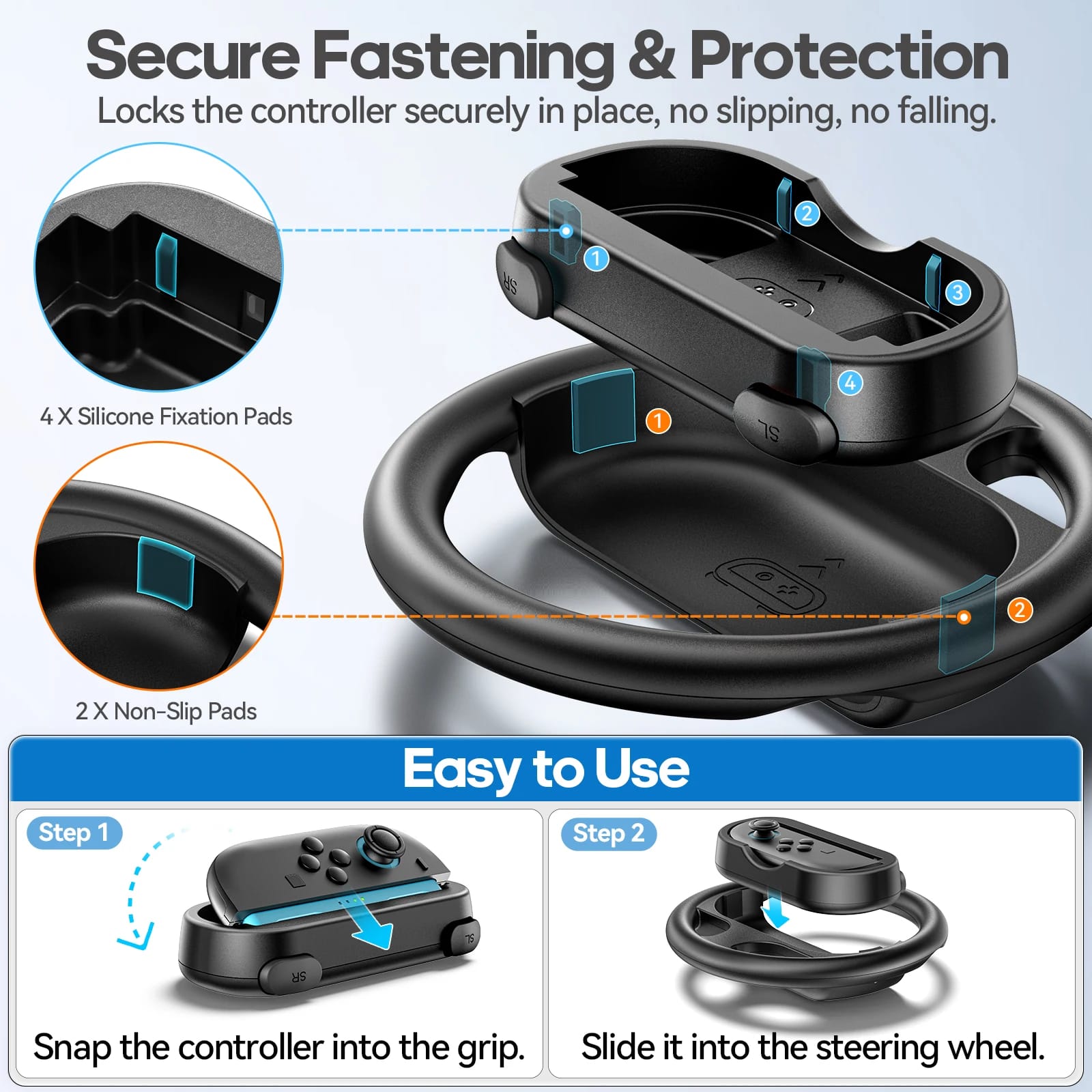 Each wheel features detachable controller grips, giving you the flexibility to race in wheel mode or play with the grips separately. The ergonomic SL/SR buttons have been enlarged for comfort during long gaming sessions, and built-in non-slip pads keep the JoyCon securely in place with no shifting or rattling.