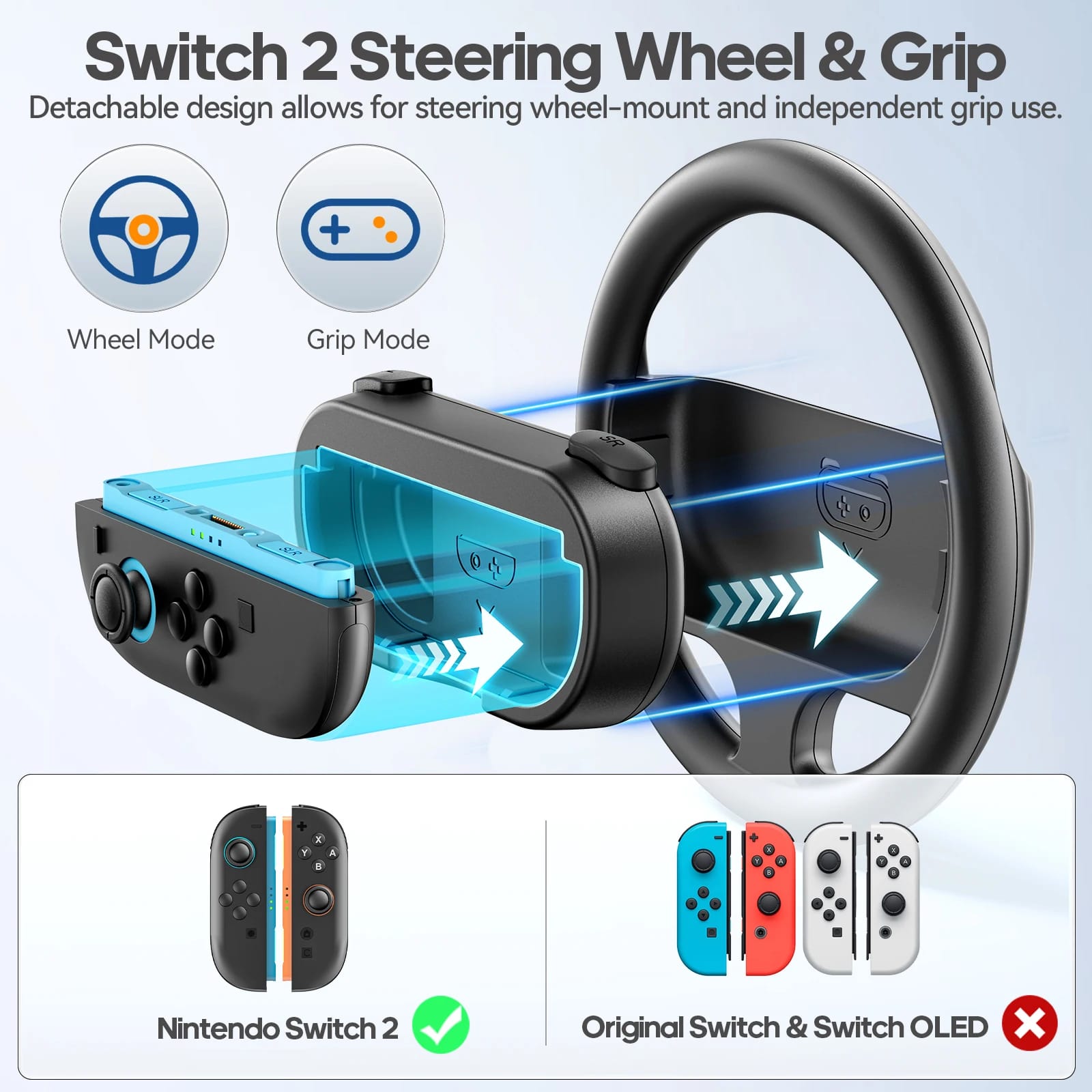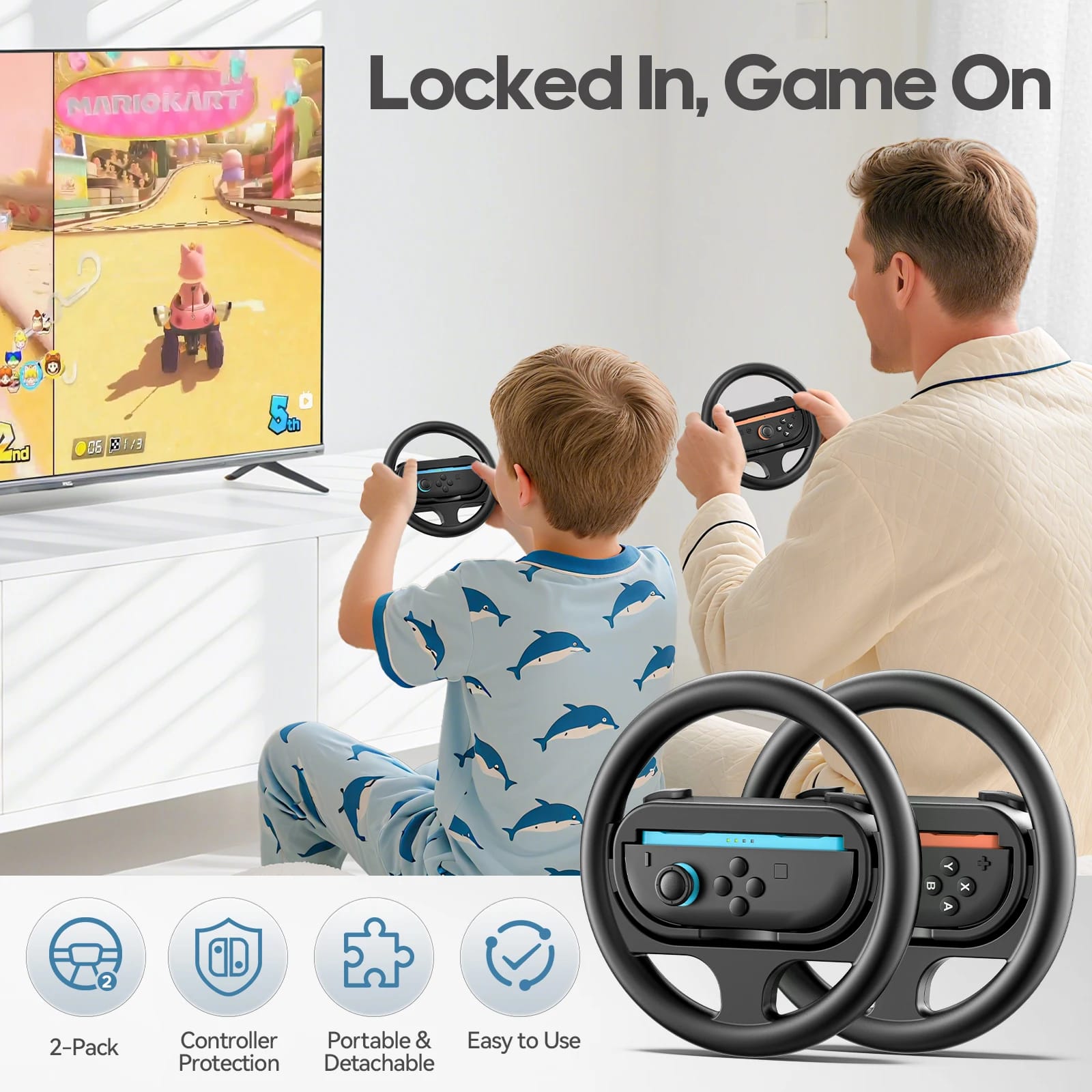 A 2-pack racing wheel and detachable grip set for Nintendo Switch 2 JoyCon, offering improved motion control, better handling, and a more immersive racing experience.